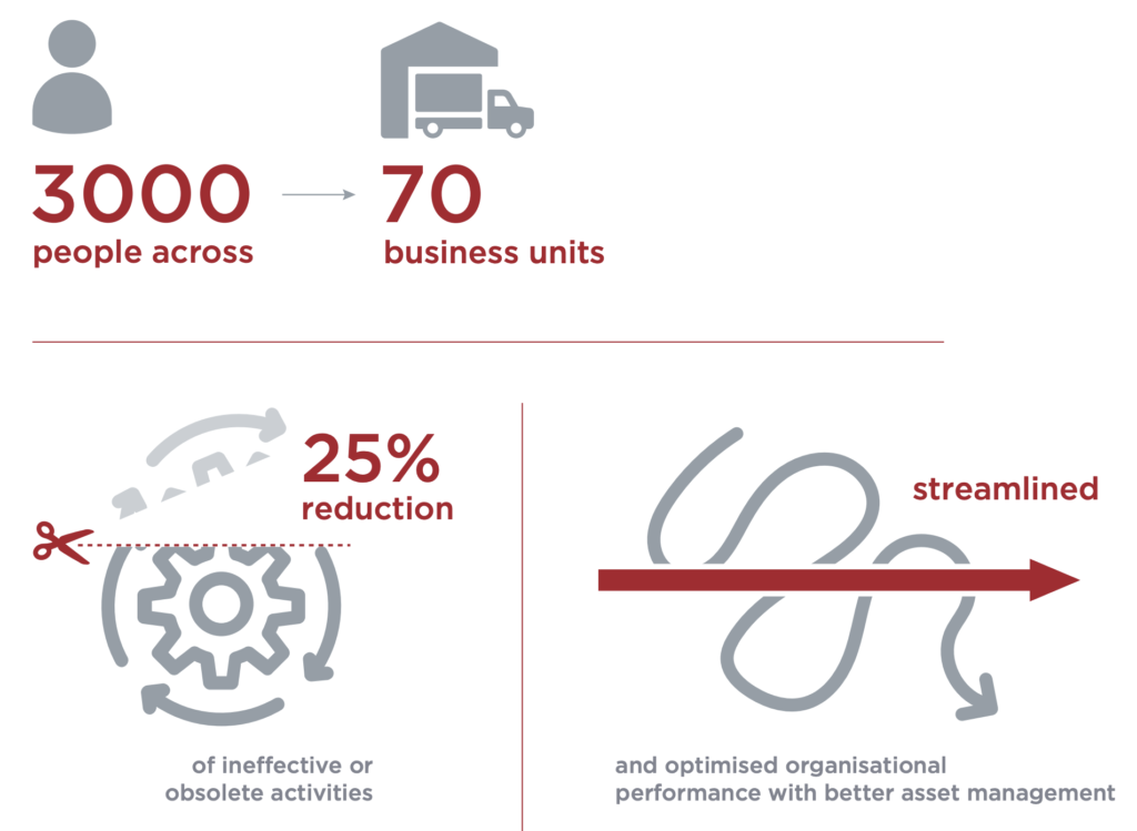 Our Client, and each of the business units within the enterprise, were able to optimise their performance by understanding what made them effective and then organise their operations and the enterprise to deliver this as efficiently as possible. We helped our client identify 25% of their current activities were either not required or ineffective in helping them to deliver capability or manage their assets. By having a consolidated current and future view of the organisation, combined with the ability forecast future resourcing requirements, our Client was equipped to strategically plan ahead, quantify the impacts when circumstances changed, and make evidence-based decisions.